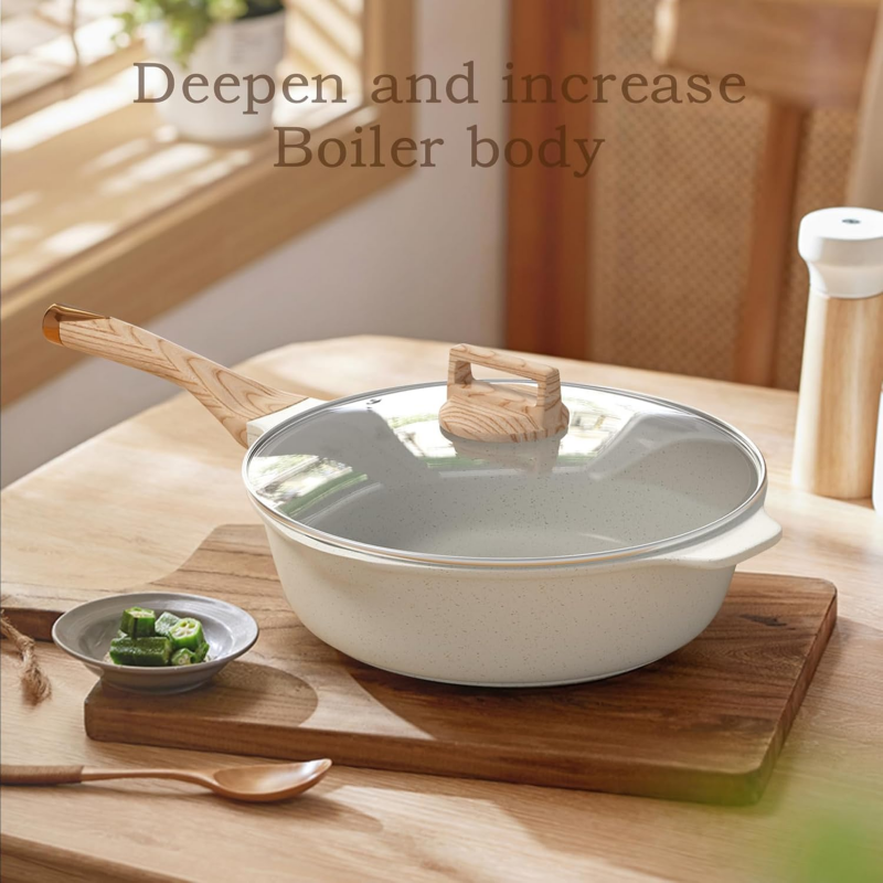 このアルミニウム製テフロン加工調理器具 16 点セットは、安全な素材、簡単な調理パフォーマンス、多目的なキッチンでの使用を重視する家庭料理人向けに設計されています。このセットは 70% アルミニウムの本体と 30% の焦げ付き防止コーティングで作られており、迅速かつ均一な熱分布を提供し、毎日の調理中のホットスポットを軽減します。滑らかなホワイト仕上げと木目調のハンドルは、幅広いキッチンインテリアに適したクリーンでモダンな外観を作り出します。