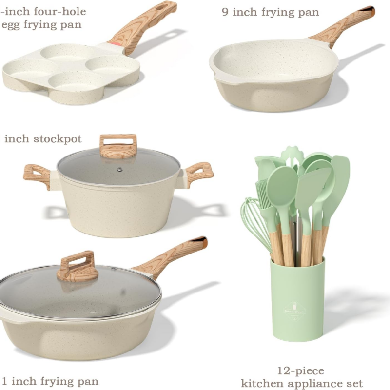 このセットには、フライパン、蓋付きソースポット、マルチエッグパン、それに適合する調理器具一式が含まれており、炒める、煮る、茹でる、盛り付けるための総合的なソリューションを提供します。耐久性のある構造と実用的な機能を備えたこの調理器具セットは、より健康的な調理習慣とキッチンでの長期使用をサポートします。